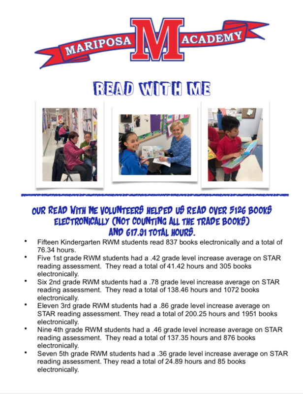 Tuesday, May 28, we celebrated the hard work these volunteers and students did throughout the year with gifts, smiles and snacks. Later this week all Mariposa students will be taking home a book donated by the Read With Me. This program and these volunteers enrich the lives of our students and our Mariposa community, we are truly grateful.