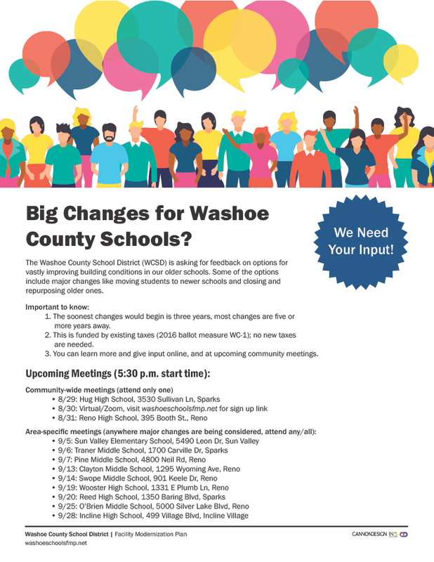We wanted to share information about upcoming community meetings regarding the Facility Modernization Plan (FMP). This information pertains to the Washoe County School District, but we wanted to share this information within our Mariposa community as some of our families could be impacted by it in the future.