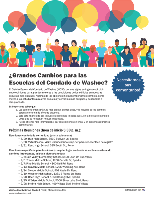 En las proximas semanas queremos compartir información con ustedes sobre las reuniones del Plan de Modernización de Instalaciones (FMP). El FMP es un plan a largo plazo para mejorar el futuro en las escuelas del Distrito Escolar del Condado de Washoe y tendrá un impacto directo en nuestros estudiantes y familiares para mejorar su experiencia académicas.